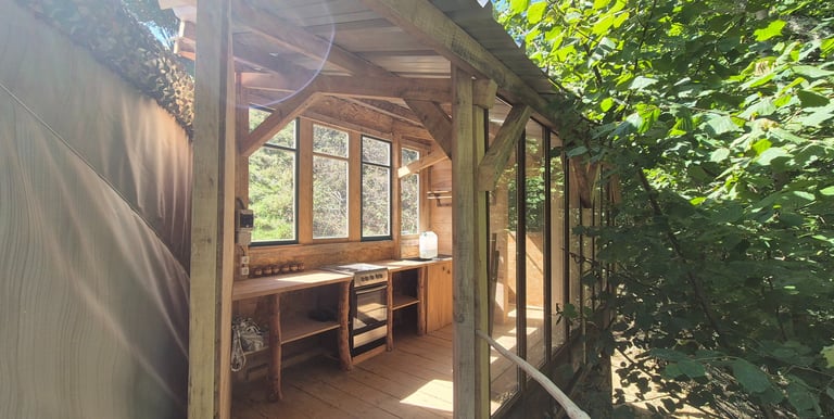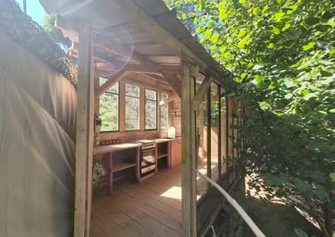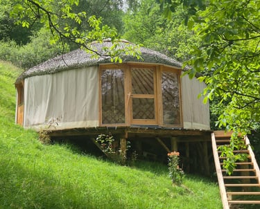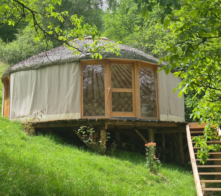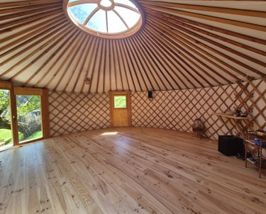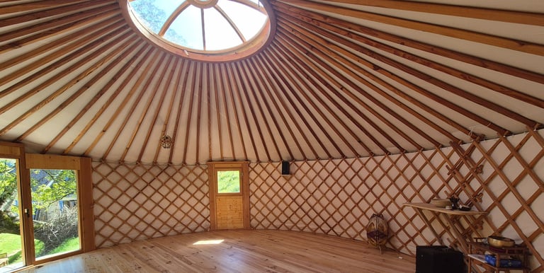 La yourte se situe en contrebas du village. Ici, c’est la rivière qui berce les séances, dans un cocon intime et vivant.